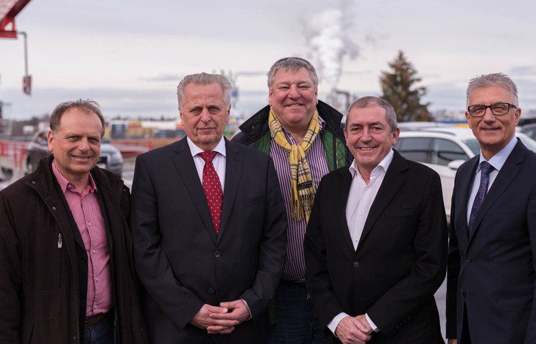 Bild 1: v.l.n.r. Helmut Schnaitl, Betriebsratsvorsitzender Arbeiter Fa. Kaindl Wals; SPÖ-Präsidentschaftskandidat Rudi Hundstorfer, Walter Huber Betriebsratsvorsitzender Angestellte Fa. Kaindl Wals; Bürgermeister der Stadt Salzburg Heinz Schaden, SPÖ-Landesparteivorsitzender Walter Steidl